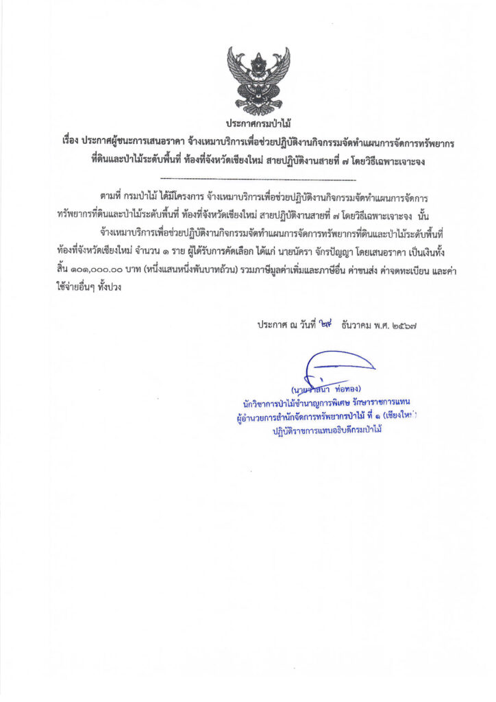 ประกาศกรมป่าไม้ เรื่องประกาศผู้ชนะการเสนอราคา จ้างเหมาบริการเพื่อช่วยปฏิบัติงานกิจกรรมจัดทำแผนการจัดที่ดินและป่าไม้ระดับพื้นที่ ท้องที่จังหวัดเชียงใหม่ สายปฏิบัติงานสายที่ ๗ โดยวิธีเฉพาะเจาะจง