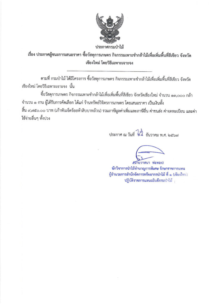 ประกาศกรมป่าไม้ เรื่อง ประกาศผู้ชนะการเสนอราคา ซื้อวัสดุการเกษตร กิจกรรมเพาะชำกล้าไม้เพื่อเพิ่มพื้นที่สีเขียว จังหวัดเชียงใหม่ โดยวิธีเฉพาะเจาะจง
