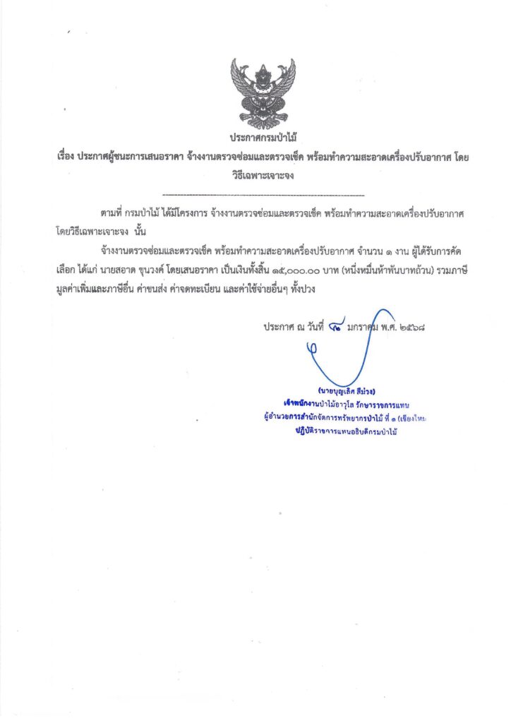 ประกาศกรมป่าไม้ เรื่อง ประกาศผู้ชนะการเสนอราคา จ้างงานตรวจซ่อมและตรวจเช็ค พร้อมทำความสะอาดเครื่องปรับอากาศ โดยวิธีเฉพาะเจาะจง8 มกราคม 2025 ใน ประกาศจัดซื้อจัดจ้าง / ประกาศผู้ชนะการเสนอราคา by adminir