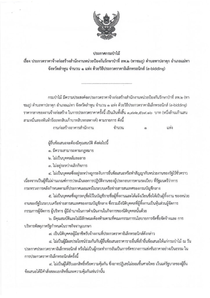 ประกาศกรมป่าไม้ เรื่อง ประกวดราคาจ้างก่อสร้างสำนักงานหน่วยป้องกันรักษาป้าที่ ลพ.๒ (ทาชมภู) ตำบลทาปลาดุก อำเภอแม่ทา จังหวัดลำพูน จำนวน ๑ แห่ง ด้วยวิธีประกวดราคาอิเล็กทรอนิกส์ (e-bidding)13 มกราคม 2025 ใน ประกวดราคาจ้าง / ประกาศจัดซื้อจัดจ้าง by adminir