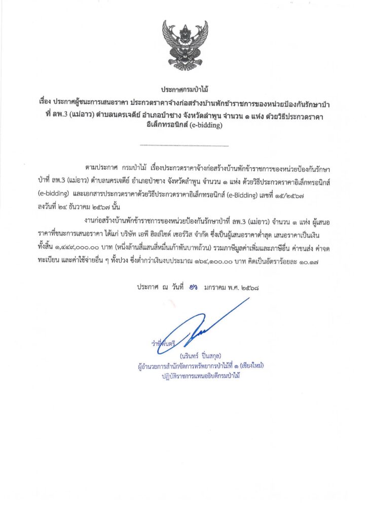 ประกาศกรมป่าไม้ เรื่อง ประกาศผู้ชนะการเสนอราคา ประกวดราคาจ้างก่อสร้างบ้านพักข้าราชการของหน่วยป้องกันรักษาป่า ที่ ลพ.3 (แม่อาว) ตำบลนครเจดีย์ อำเภอป่าซาง จังหวัดลำพูน จำนวน ๑ แห่ง ด้วยวิธีประกวดราคาอิเล็กทรอนิกส์ (e-bidding)