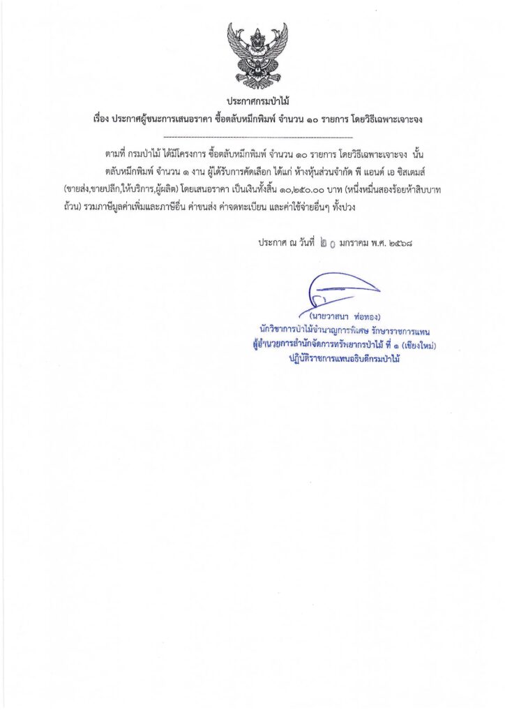 ประกาศกรมป่าไม้ เรื่อง ประกาศผู้ชนะการเสนอราคา ซื้อตลับหมึกพิมพ์ จำนวน ๑๐ รายการ โดยวิธีเฉพาะเจาะจง20 มกราคม 2025 ใน ประกาศจัดซื้อจัดจ้าง / ประกาศผู้ชนะการเสนอราคา by adminir