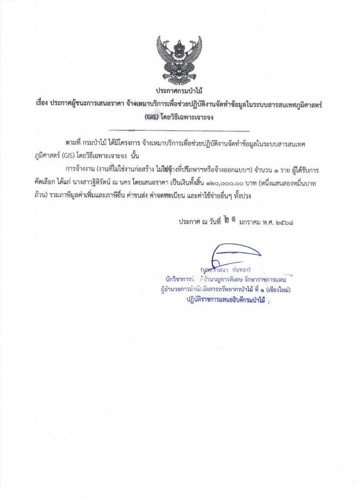 ประกาศกรมป่าไม้ เรื่อง ประกาศผู้ชนะการเสนอราคา จ้างเหมาบริการเพื่อช่วยปฏิบัติงานจัดทำข้อมูลในระบบสารสนเทศภูมิศาสตร์ (GIS) โดยวิธีเฉพาะเจาะจง