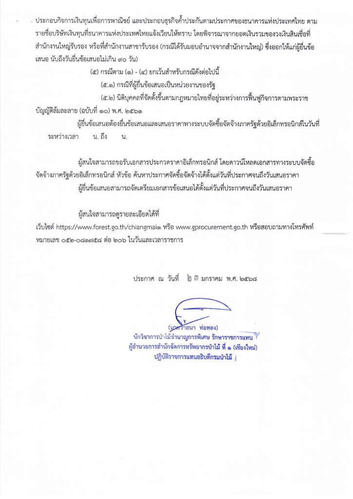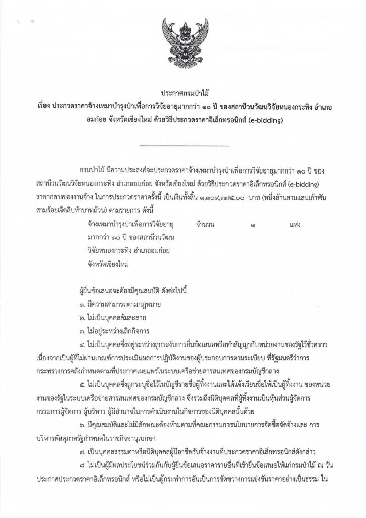 ประกาศกรมป่าไม้ เรื่อง ประกวดราคาจ้างเหมาบำรุงป่าเพื่อการจัยอายุมากกว่า ๑๐ ปี ของสถานีวนวัฒนวิจัยหนองกระทิง อำเภออมก๋อย จังหวัดเชียงใหม่ ด้วยวิธีประกวดราคาอิเล็กทรอนิกส์ (e-bidding)24 มกราคม 2025 ใน ประกวดราคาจ้าง / ประกาศจัดซื้อจัดจ้าง by adminir
