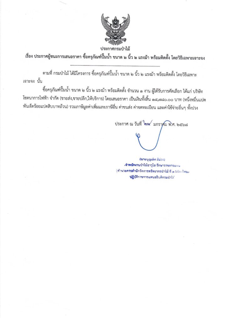 ประกาศกรมป่าไม้ เรื่อง ประกาศผู้ชนะการเสนอราคา ซื้อครุภัณฑ์ปั้มน้ำ ขนาด ๒ นิ้ว ๒ แรงม้า พร้อมติดตั้ง โดยวิธีเฉพาะเจาะจง27 มกราคม 2025 ใน ประกาศจัดซื้อจัดจ้าง / ประกาศผู้ชนะการเสนอราคา by adminir