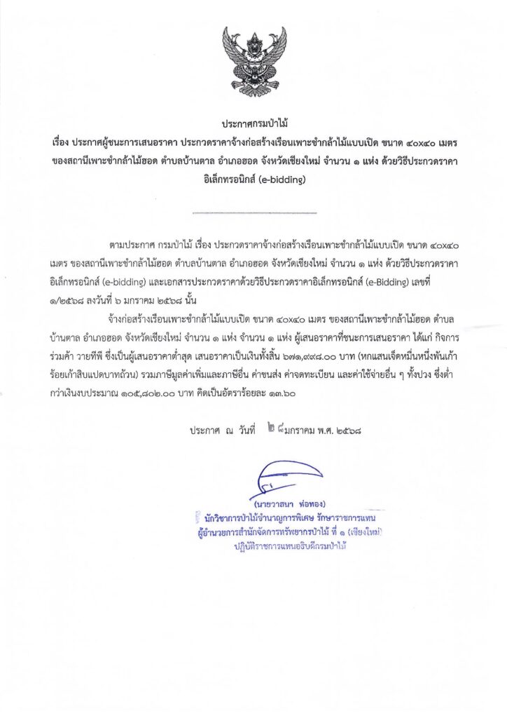 ประกาศกรมป่าไม้ เรื่อง ประกาศผู้ชนะเสนอราคา ประกวดราคาจ้างก่อสร้างเรือนเพาะชำกล้าไม้แบบเปิด ขนาด ๔๐x๔๐ เมตร ของสถานีเพาะชำกล้าไม้ฮอด ตำบลบ้านตาล อำเภอฮอต จังหวัดเชียงใหม่ จำนวน ๑ แห่ง ด้วยวิธีประกวดราคาอิเล็กทรอนิกส์ (e-bidding)29 มกราคม 2025 ใน ประกาศจัดซื้อจัดจ้าง / ประกาศผู้ชนะการเสนอราคา by adminir