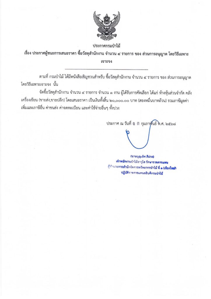 ประกาศกรมป่าไม้ เรื่อง ประกาศผู้ชนะการเสนอราคา ซื้อวัสดุสำนักงาน จำนวน ๔ รายการ ของ ส่่วนการอนุญาต โดยวิธีเฉพาะเจาะจง13 กุมภาพันธ์ 2025 ใน ประกาศจัดซื้อจัดจ้าง / ประกาศผู้ชนะการเสนอราคา by adminir