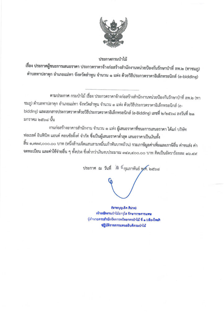 ประกาศกรมป่าไม้ เรื่อง ประกาศผู้ชนะการเสนอราคา ประกวดราคาจ้างก่อสร้างสำนักงานหน่วยป้องกันรักษาษาที่ ลพ.๒ (ทาชมภู) ตำบลทาปลาดุก อำเภอแม่ทา จังหวัดลำพูน จำนวน ๑ แห่ง ด้วยวิธีประกวดราคาอิเล็กทรอนิกส์ (e-bidding)14 กุมภาพันธ์ 2025 ใน ประกาศจัดซื้อจัดจ้าง / ประกาศผู้ชนะการเสนอราคา by adminir