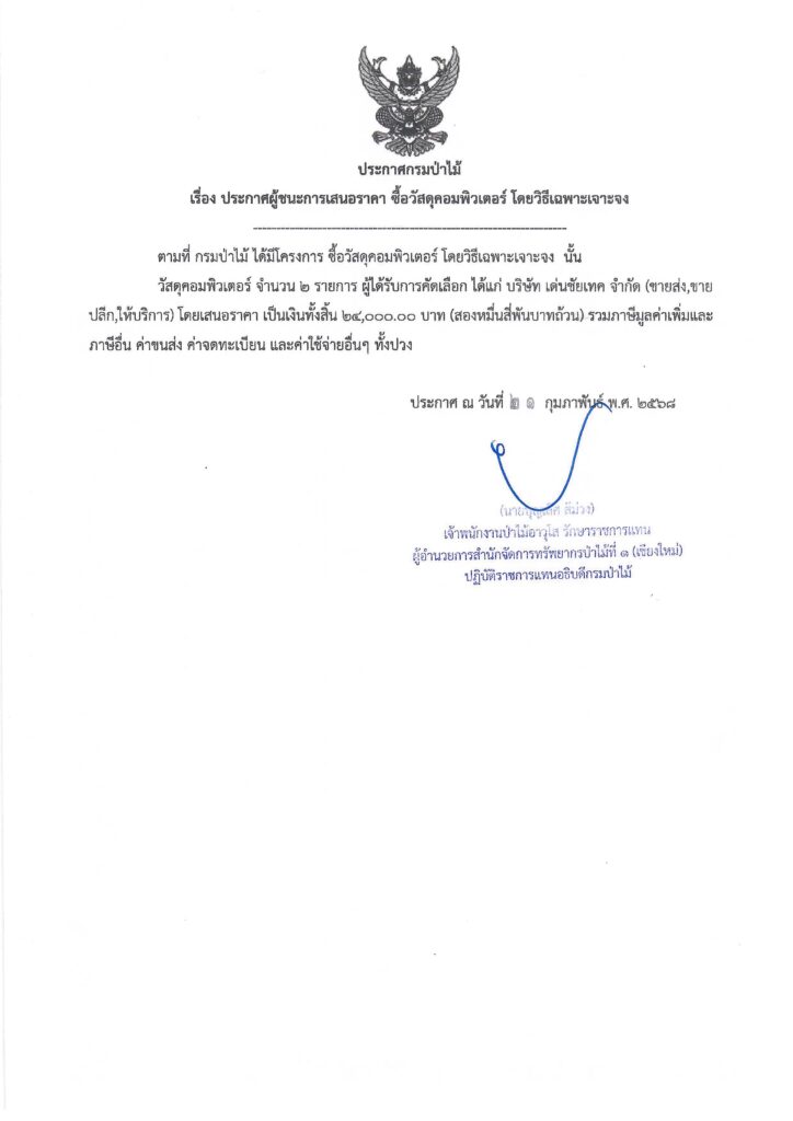 ประกาศกรมป่าไม้ เรื่อง ประกาศผู้ชนะการเสนอราคา ซื้อวัสดุคอมพิวเตอร์ โดยวิธีเฉพาะเจาะจง21 กุมภาพันธ์ 2025 ใน ประกาศจัดซื้อจัดจ้าง / ประกาศผู้ชนะการเสนอราคา by adminir