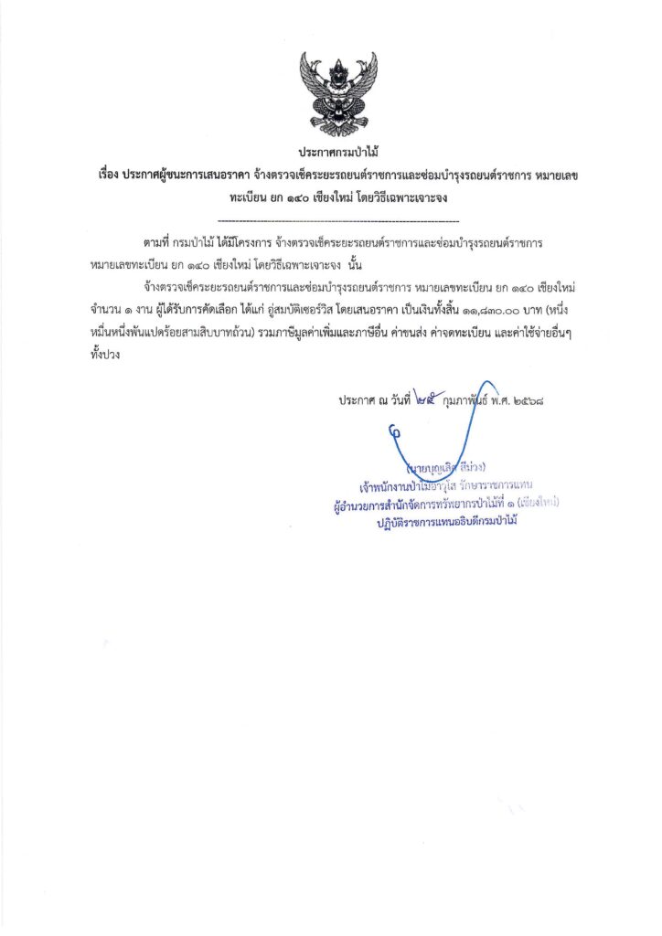 ประกาศกรมป่าไม้ เรื่อง ประกาศผู้ชนะการเสนอราคา จ้างตรวจเช็คระยะรถยนต์ราชการและซ่อมบำรุงรถยนต์ราชการ หมายเลขทะเบียน ยก ๑๔๐ เชียงใหม่ โดยวิธีเฉพาะเจาะจง25 กุมภาพันธ์ 2025 ใน ประกาศจัดซื้อจัดจ้าง / ประกาศผู้ชนะการเสนอราคา by adminir
