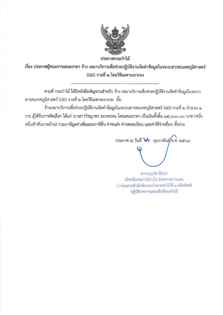 ประกาศกรมป่าไม้ เรื่อง ประกาศผู้ชนะการเสนอราคา จ้างเหมาบริการเพื่อช่วยปฏิบัติงานจัดทำข้อมูลในระบบสารสนเทศภูมิศาสตร์(GIS) รายที่ ๒ โดยวิธีเฉพาะเจาะจง26 กุมภาพันธ์ 2025 ใน ประกาศจัดซื้อจัดจ้าง / ประกาศผู้ชนะการเสนอราคา by adminir