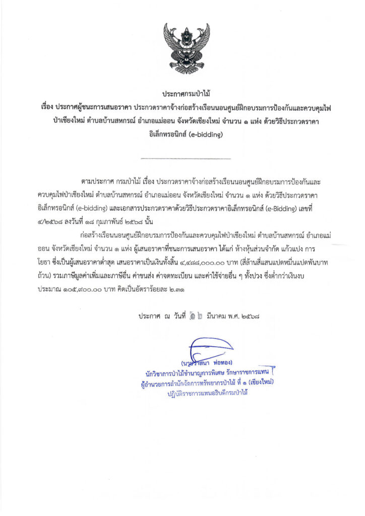ประกาศกรมป่าไม้ เรื่อง ประกาศผู้ชนะการเสนอราคา ประกวดราคาจ้างก่อสร้างเรือนนอนศูนย์ฝึกอบรมการป้องกันและควบคุบคุมไฟปาเชียงไหม่ ตำบลบ้านสหกรณ์ อำเภอแม่ออน จังหวัดเชียงใหม่ จำนวน ๑ แห่ง ด้วยวิธีประกวดราคาอิเล็กทรอนิกส์ (e-bidding)13 มีนาคม 2025 ใน ประกาศจัดซื้อจัดจ้าง / ประกาศผู้ชนะการเสนอราคา by adminir