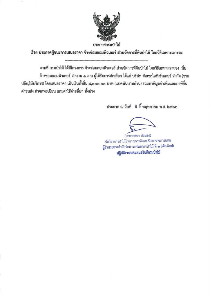 ประกาศกรมป่าไม้15 พฤษภาคม 2023 ใน ประกาศจัดซื้อจัดจ้าง by adminir เรื่อง ประกาศผู้ชนะการเสนอราคา จ้างซ่อมคอมพิวเตอร์ ส่วนจัดการที่ดินป่าไม้ โดยวิธีเฉพาะเจาะจง