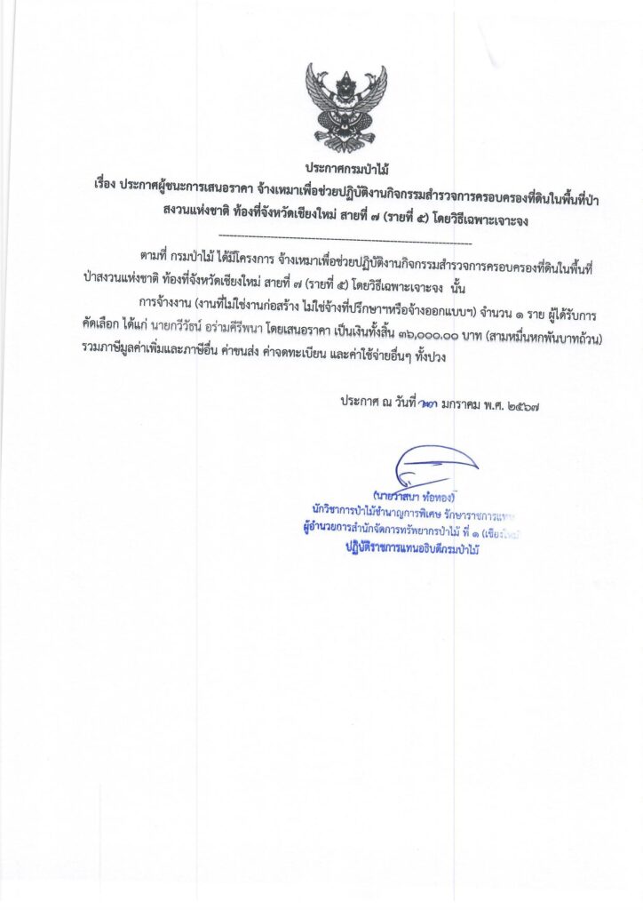 ประกาศกรมป่าไม้24 มกราคม 2024 ใน ประกาศจัดซื้อจัดจ้าง by adminir ประกาศกรมป่าไม้ เรื่อง ประกาศผู้ชนะการเสนอราคา จ้างเหมาเพื่อช่วยปฏิบัติงานกิจกรรมสำรวจการครอบครองที่ดินในพื้นที่ป่าสงวนแห่งชาติ ท้องที่จังหวัดเชียงใหม่ สายที่ ๗ (รายที่ ๕ ) โดยวิธีเฉพาะเจาะจง