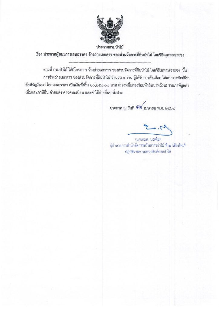 ประกาศกรมป่าไม้19 เมษายน 2021 ใน ไม่มีหมวดหมู่ by adminir เรื่อง ประกาศผู้ชนะการเสนอราคา จ้างถ่ายเอกสาร ของส่วนจัดการที่ดินป่ไม้ โดยวิธีเฉพาะเจาะจง