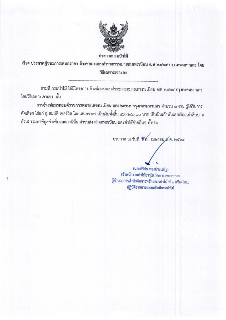 ประกาศกรมป่าไม้19 เมษายน 2021 ใน ไม่มีหมวดหมู่ by adminir เรื่อง ประกาศผู้ชนะการเสนอราคา จ้างซ่อมรถยนต์ราชการหมายเลขทะเบียน ฒห 6964 กรุงเทพมหานคร โดยวิธีเฉพาะเจาะจง