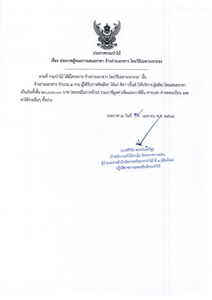 ประกาศกรมป่าไม้19 เมษายน 2021 ใน ไม่มีหมวดหมู่ by adminir เรื่อง ประกาศผู้ชนะการเสนอราคา จ้างถ่ายเอกสาร โดยวิธีเฉพาะเจาะจง