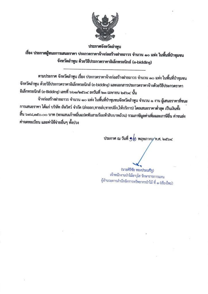 ประกาศกรมป่าไม้12 พฤษภาคม 2021 ใน ไม่มีหมวดหมู่ by adminir เรื่อง ประกาศผู้ชนะการเสนอราคา ประกาดราคาจ้างก่อสร้างฝายถาวร จำนวน 10 แห่ง ในพื้นที่ป่าชุมชนจังหวัดลำพูน ด้วยวิธีประกวดราคาอิเล็กทรอนิกส์ (e-biddling)