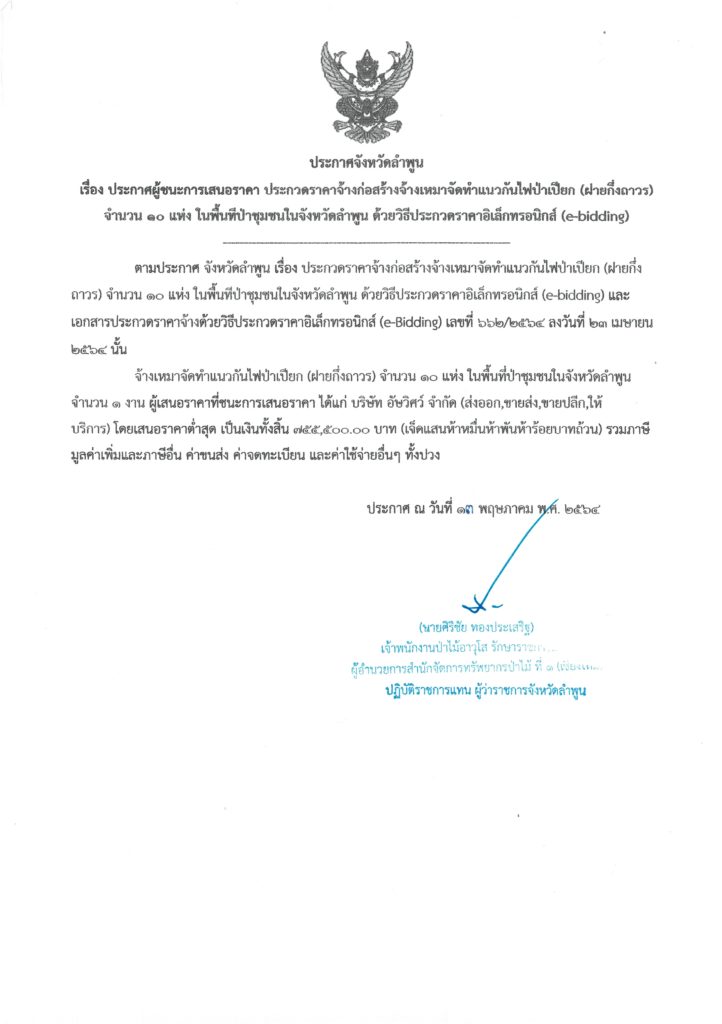 ประกาศกรมป่าไม้ เรื่อง ประกาศผู้ชนะการเสนอราคา ประกวดราคาจ้างก่อสร้างจ้างเหมาจัดทำแนวกันไฟป่าเปียก (ฝ่ายกึ่งถาวร) จำนวน 10 แห่งในพื้นที่ป่าชุมชนในจังหวัดลำพูน ด้วยวิธีประกวดราคาอิเล็กทรอนิกส์ (e-bidding)