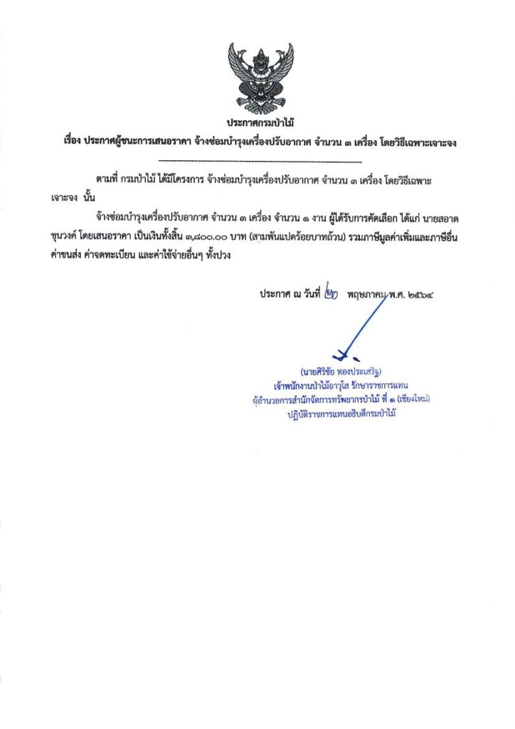 ประกาศกรมป่าไม้20 พฤษภาคม 2021 ใน ไม่มีหมวดหมู่ by adminir ประกาศกรมป่าไม้ เรื่อง ประกาศผู้ชนะการเสนอราคา จ้างซ่อมบำรุงเครื่องปรับอากาศ จำนวน 3 เครื่อง โดยวิธีเฉพาะเจาะจง