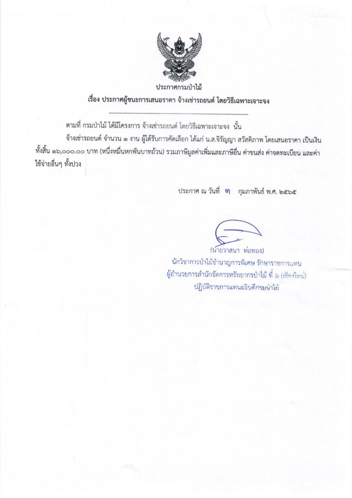 ประกาศกรมป่าไม้22 กุมภาพันธ์ 2022 ใน ไม่มีหมวดหมู่ by adminir เรื่อง ประกาศผู้ชนะการเสนอราคา จ้างเช่ารถยนต์ โดยวิธีเฉพาะเจาะจง