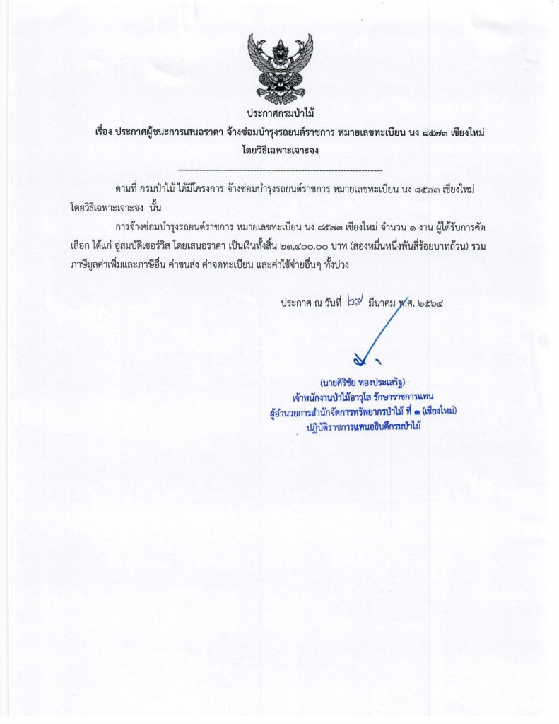 ประกาศกรมป่าไม้29 มีนาคม 2021 ใน ไม่มีหมวดหมู่ by adminir เรื่อง ประกาศผู้ชนะการเสนอราคาจ้างซ่อมบำรุงรถยนต์ราชการ หมายเลขทะเบียน นง 8573 เชียงใหม่ โดยวิธีเฉาพาะเจาะจง