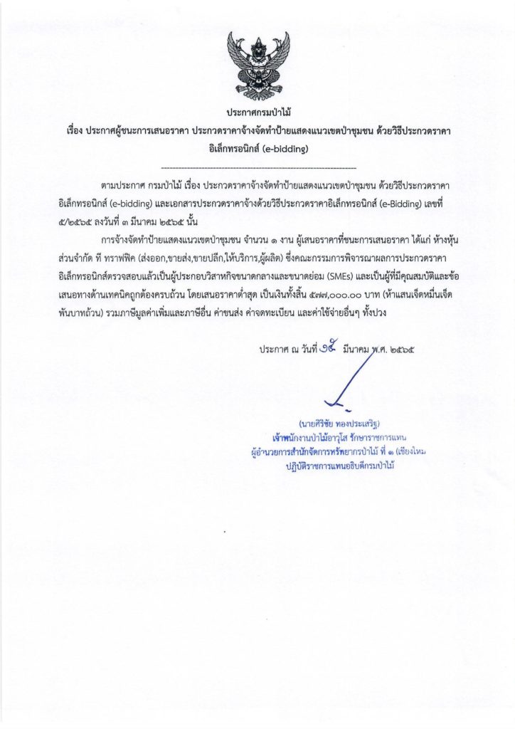 เรื่องประกาศผู้ชนะการเสนอราคา ประกวดราคาจ้างจัดทำป้ายแสดงแนวเขตป่าชุมชน ด้วยวิธีประกวดราคาอิเล็กทรอนิกส์ (e-bidding)