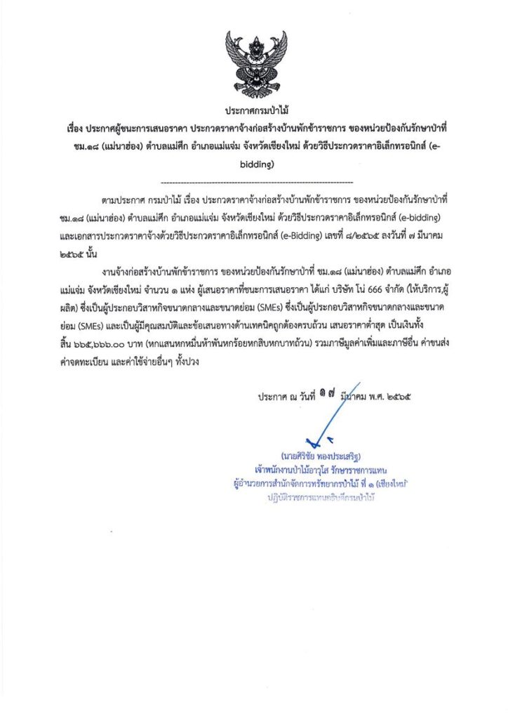 เรื่อง ประกาศผู้ชนะการเสนอราคา ประกวดราคาจ้างก่อสร้างบ้านพักข้าราชการ ของหน่วยป้องกันรักษาป่าที่