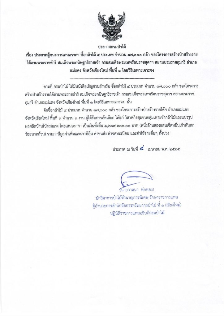 ประกาศกรมป่าไม้4 เมษายน 2022 ใน ไม่มีหมวดหมู่ by adminir เรื่อง ประกาศผู้ชนะการเสนอราคา ซื้อกล้าไม้ ๔ ประเภท จำนวน ๗๗,๐๐๐ กล้า ของโครงการสร้างป่าสร้างราย ได้ตามพระราชดำริ สมเด็จพระกนิษฐาธิราชเจ้า กรมสมเด็จพระเทพรัตนราชสุดาฯ สยามบรมราชกุมารี อำเภอ แม่แตง จังหวัดเชียงใหม่ พื้นที่ ๑ โดยวิธีเฉพาะเจาะจง