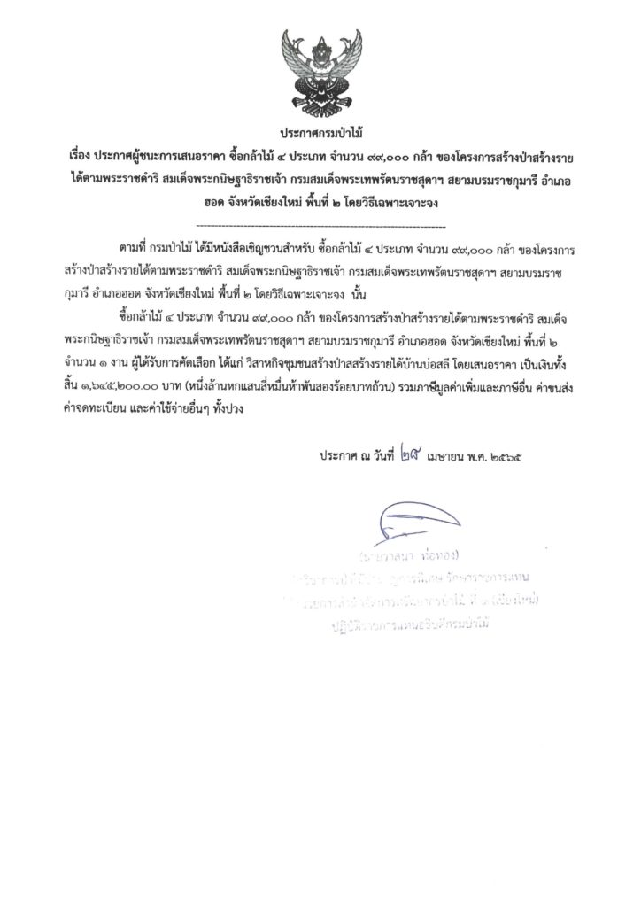 ประกาศกรมป่าไม้28 เมษายน 2022 ใน ไม่มีหมวดหมู่ by adminir เรื่อง ประกาศผู้ชนะการเสนอราคา ซื้อกล้าไม้ 4 ประเภท จำนวน 99,000 กล้า ของโครงการสร้างป่าสร้างราย ได้ตามพระราชดำริ สมเด็จพระกนิษฐาธิราชเจ้า กรมสมเด็จพระเทพรัตนราชสุดาฯ สยามบรมราชกุมารี อำเภอ ฮอด จังหวัดเชียงใหม่ พื้นที่ 2 โดยวิธีเฉพาะเจาะจง