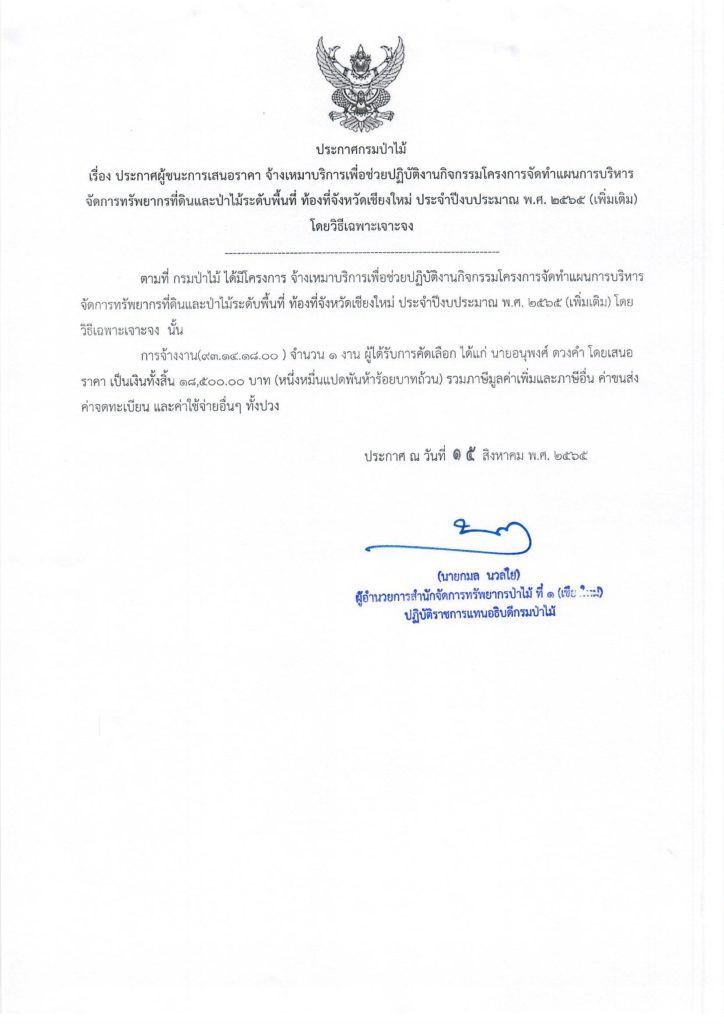 ประกาศกรมป่าไม้15 สิงหาคม 2022 ใน ไม่มีหมวดหมู่ by adminir ประกาศกรมป่าไม้ เรื่อง ประกาศผู้ชนะการเสนอราคา จ้างเหมาบริการเพื่อช่วยปฏิบัติงานกิจกรรมโครงการจัดทำแผนการบริหารจัดการทรัพยากรที่ดินและป่าไม้ระดับพื้นที่ ท้องที่จังหวัดเขียงใหม่ ประจำปีงบประมาณ พ.ศ. ๒๕๖๕ (เพิ่มเติม) โดยวิธีเฉพาะเจาะจง