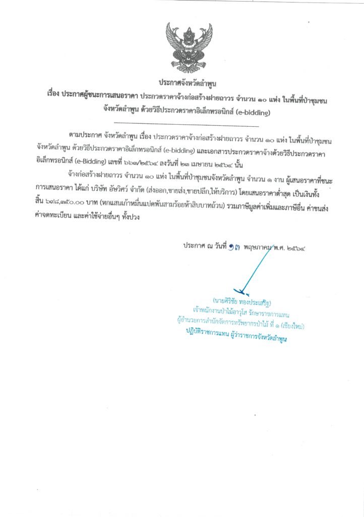 ประกาศจังหวัดลำพูน เรื่อง ประกาศผู้ชนะการเสนอราคา ประกวดราคาจ้างก่อสร้างฝ่ายถาวร จำนวน 10 แห่ง ในพื้นที่ป่าชุมชน จังหวัดลำพูน ด้วยวิธีประกวดราคาอิเล็กทรอนิกส์ (e-bidding)13 พฤษภาคม 2021 ใน ประกาศ by adminir