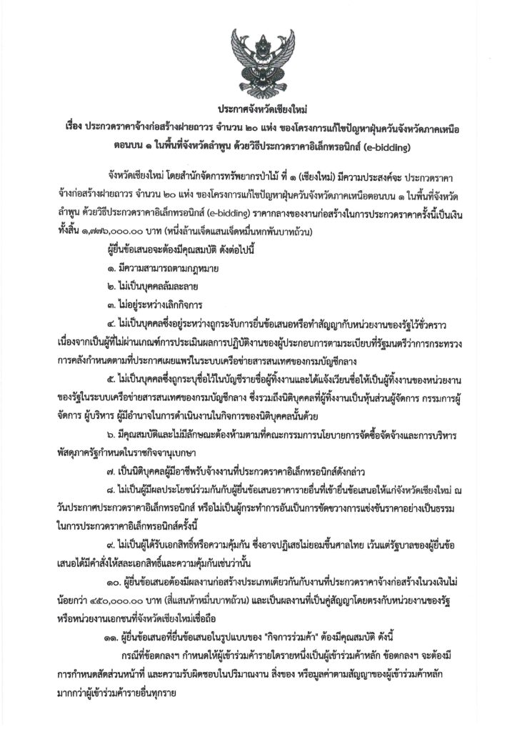 ประกาศจังหวัดเชียงใหม่ เรื่องประะกวดราคาจ้างก่อสร้างฝายถาวร จำนวน ๒๐ แห่ง ของโครงการแก้ไขปัญหาฝุ่นควันจังหวัดภาคเหนือตอนบน ๑ ในพื้นที่จังหวัดลำพูน ด้วยวิธีประกวดราคาอิเล็กทรอนิกส์ (e-bidding)