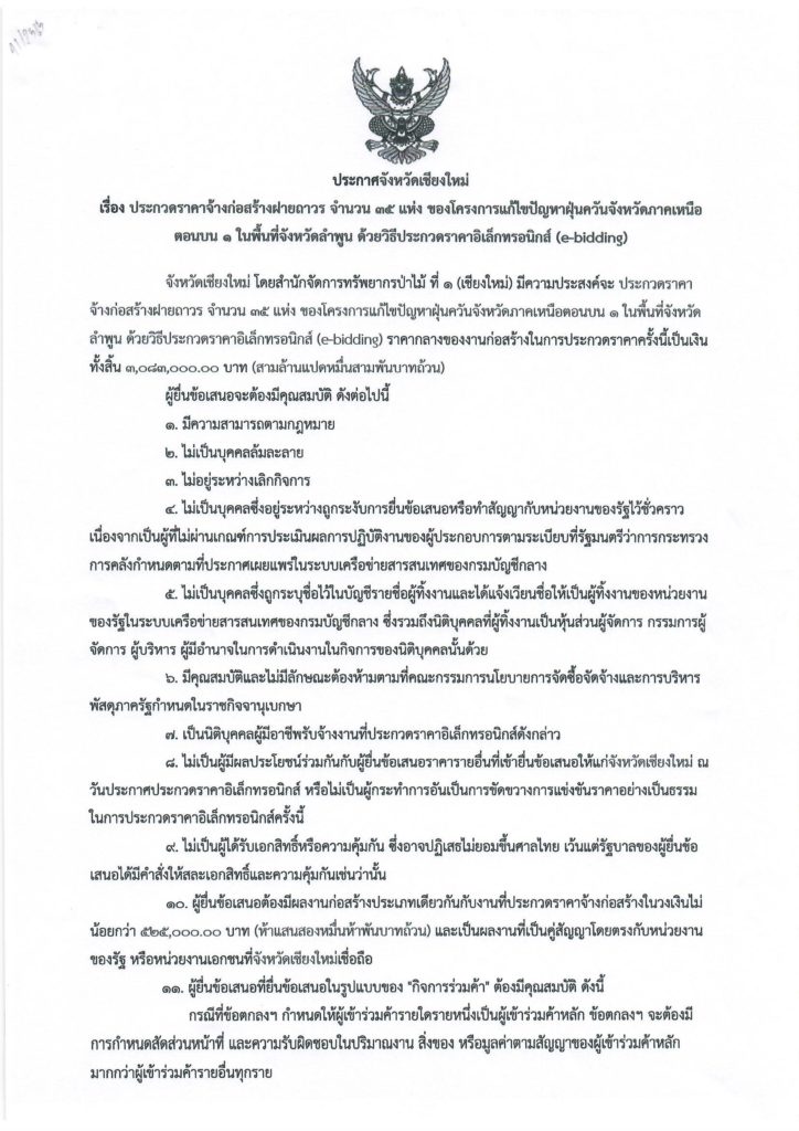 ประกาศจังหวัดเชียงใหม่15 มีนาคม 2022 ใน ไม่มีหมวดหมู่ by adminir เรื่อง ประกวดราคาจ้างก่อสร้างฝายถาวร จำนวน 35 แห่ง ของโครงการแก้ไขปัญหาฝุ่นควันจังหวัดภาคเหนือตอนบน 1 ในพื้นที่จังหวัดลำพูน ด้วยวิธีประกวดราคาอิเล็กทรอนิกส์ (e-bidding)
