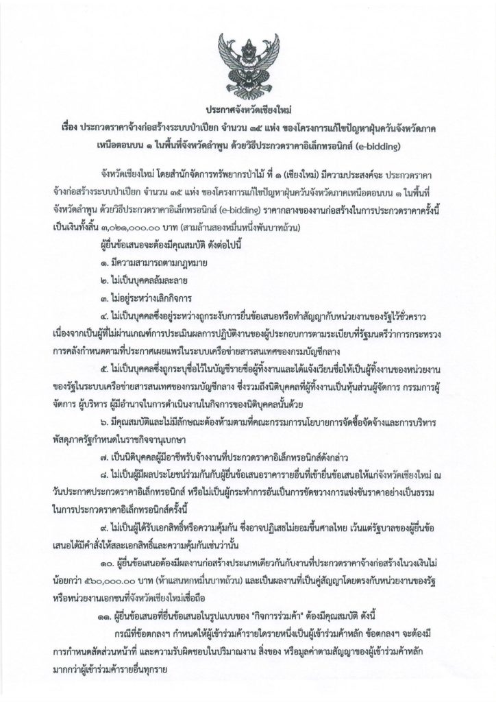 ประกาศจังหวัดเชียงใหม่15 มีนาคม 2022 ใน ไม่มีหมวดหมู่ by adminir เรื่อง ประกวดราคาจ้างก่อสร้างระบบป่าเปียก จำนวน 35 แห่ง ของโครงการแก้ไขปัญหาฝุ่นควันจังหวัดภาคเหนือตอนบน 1 ในพื้นที่จังหวัดลำพูน ด้วยวิธีประกวดราคาอิเล็กทรอนิกส์ (e-bidding)