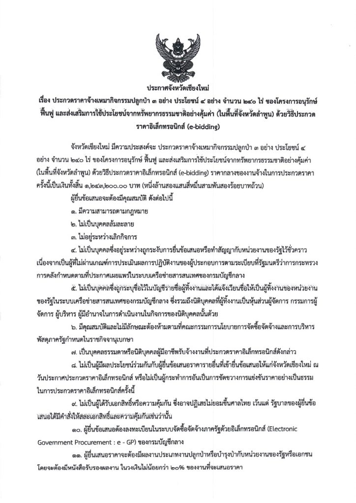 หน้าแรก » ประกาศ » ประกาศจังหวัดเชียงใหม่ เรื่อง ประกวดราคาจ้างเหมากิจกรรมปลูกบำ 3 อย่าง ประโยชน์ 4 อย่าง จำนวน 240 ไร่ ของโครงการอนุรักษ์ ฟื้นฟู และส่งเสริมการใช้ประโยชน์จากทรัพยากรธรรมชาติอย่างคุ้มค่า (ในพื้นที่จังหวัดลำพูน) ด้วยวิธีประกวดราคาอิเล็กทรอนิกส์ (e-bidding)