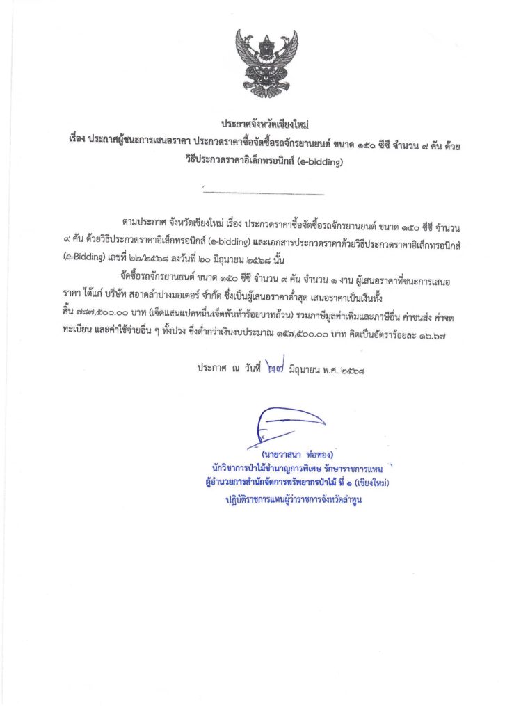 ประกาศจังหวัดเชียงใหม่ เรื่อง ประกาศผู้ชนะการเสนอราคา ประกวดราคาซื้อจัดซื้อรถจักรยานยนต์ ขนาด ๑๕๐ ซีซี จำนวน ๙ คัน ด้วยวิธีประกวดราคาอิเล็กทรอนิกส์ (e-bidding)1 กรกฎาคม 2025 ใน ประกาศจัดซื้อจัดจ้าง / ประกาศผู้ชนะการเสนอราคา by adminir
