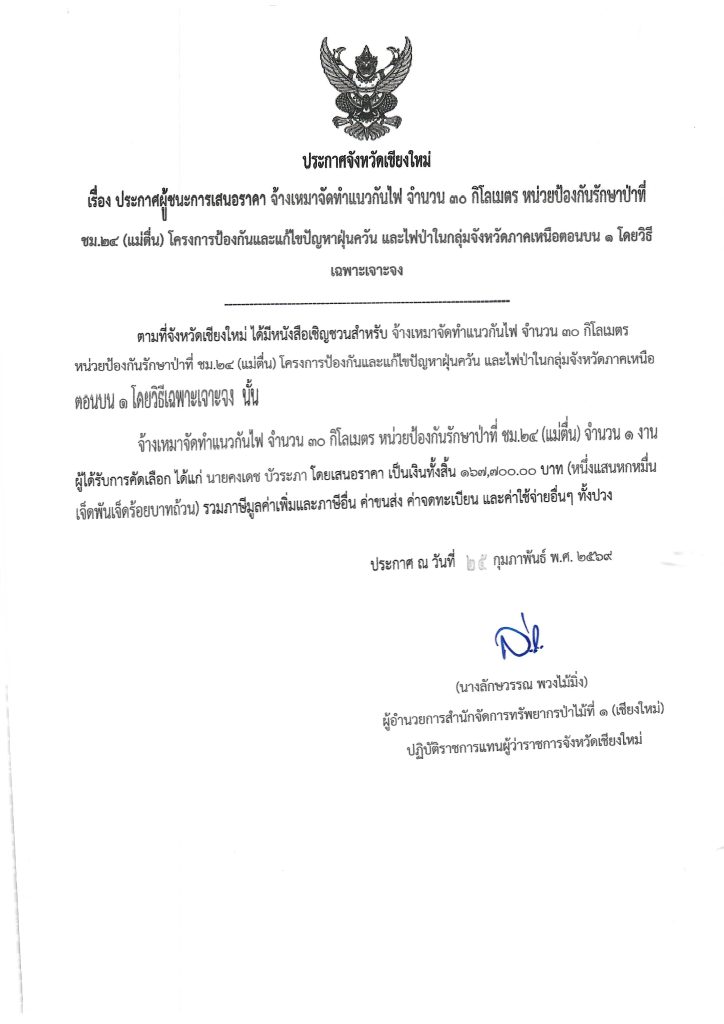 ประกาศจังหวัดเชียงใหม่ เรื่อง ประกาศผู้ชนะการเสนอราคา จ้างเหมาจัดทำแนวกันไฟ จำนวน ๓๐ กิโลเมตร หน่วยป้องกันรักษาป่าชม.๒๔ (แม่ตื่น) โครงการป้องกันและแก้ไขปัญหาฝุ่นควัน และไฟป่าในกลุ่มจังหวัดภาคเหนือตอนบน ๑ โดยวิธีเฉพาะเจาะจง6 มีนาคม 2026 ใน ประกาศจัดซื้อจัดจ้าง / ประกาศผู้ชนะการเสนอราคา by adminir