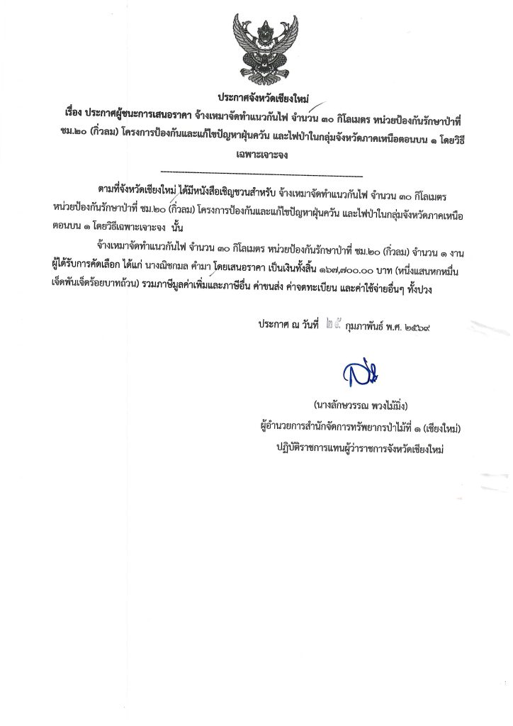 ประกาศจังหวัดเชียงใหม่ เรื่อง ประกาศผู้ชนะการเสนอราคา จ้างเหมาจัดทำแนวกันไฟ จำนวน ๓๐ กิโลเมตร หน่วยป้องกันรักษาป่าที่ชม.๒๐ (กิ่วลม) โครงการป้องกันและแก้ไขปัญหาฝุ่นควัน และไฟป่าในกลุ่มจ้งหวัดภาคเหนือตอนบน ๑ โดยวิธีเฉพาะเจาะจง6 มีนาคม 2026 ใน ประกาศจัดซื้อจัดจ้าง / ประกาศผู้ชนะการเสนอราคา by adminir