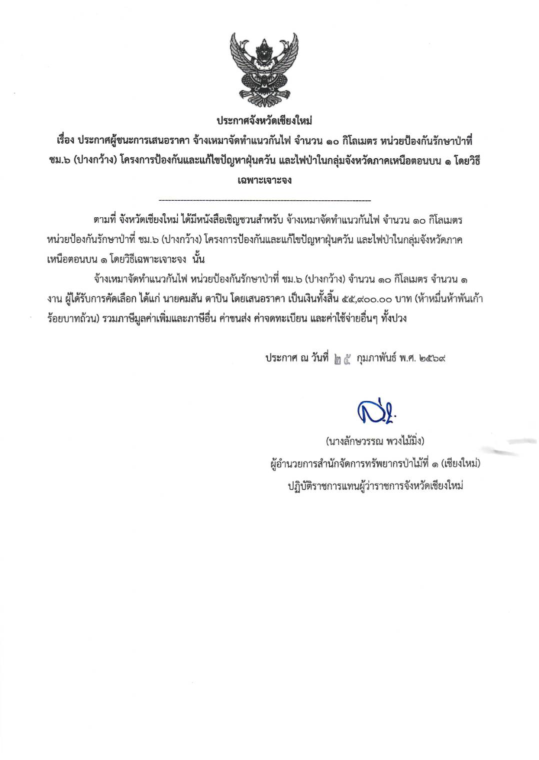 ประกาศผู้ชนะการเสนอราคา จ้างเหมาจัดทำแนวกันไฟ จำนวน ๑๐ กิโลเมตร หน่วยป้องกันรักษาป่าที่ ชม.๖ (ปากกว้าง) โครงการป้องกันและแก้ไขปัญหาฝุ่นควันและไฟป่าในกลุ่มจังหวัด ภาคหนือตอนบน ๑ โดยวิธีเฉพาะเจาะจง