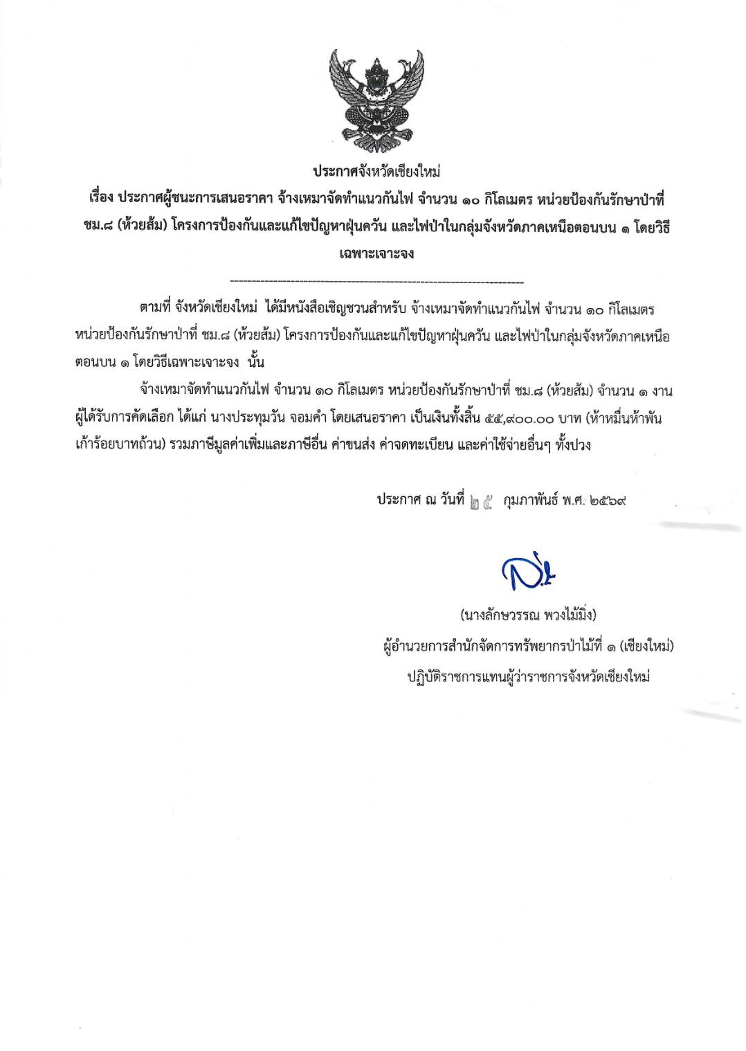 ประกาศผู้ชนะการเสนอราคา จ้างเหมาจัดทำแนวกันไฟ จำนวน ๑๐ กิโลเมตร หน่วยป้องกันรักษาป่าที่ ชม.๘ (ห้วยส้ม) โครงการป้องกันและแก้ไขปัญหาฝุ่นควันและไฟป่าในกลุ่มจังหวัด ภาคหนือตอนบน ๑ โดยวิธีเฉพาะเจาะจง5 มีนาคม 2026 ใน ประกาศจัดซื้อจัดจ้าง / ประกาศผู้ชนะการเสนอราคา by adminir