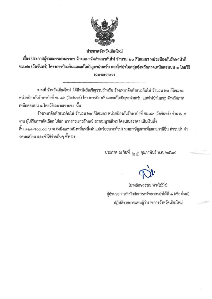 ประกาศผู้ชนะการเสนอราคา จ้างเหมาจัดทำแนวกันไฟ จำนวน ๒๐ กิโลเมตร หน่วยป้องกันรักษาป่าที่ ชม.๑๒ (วัดจันทร์) โครงการป้องกันและแก้ไขปัญหาฝุ่นควันและไฟป่าในกลุ่มจังหวัด ภาคหนือตอนบน ๑ โดยวิธีเฉพาะเจาะจง
