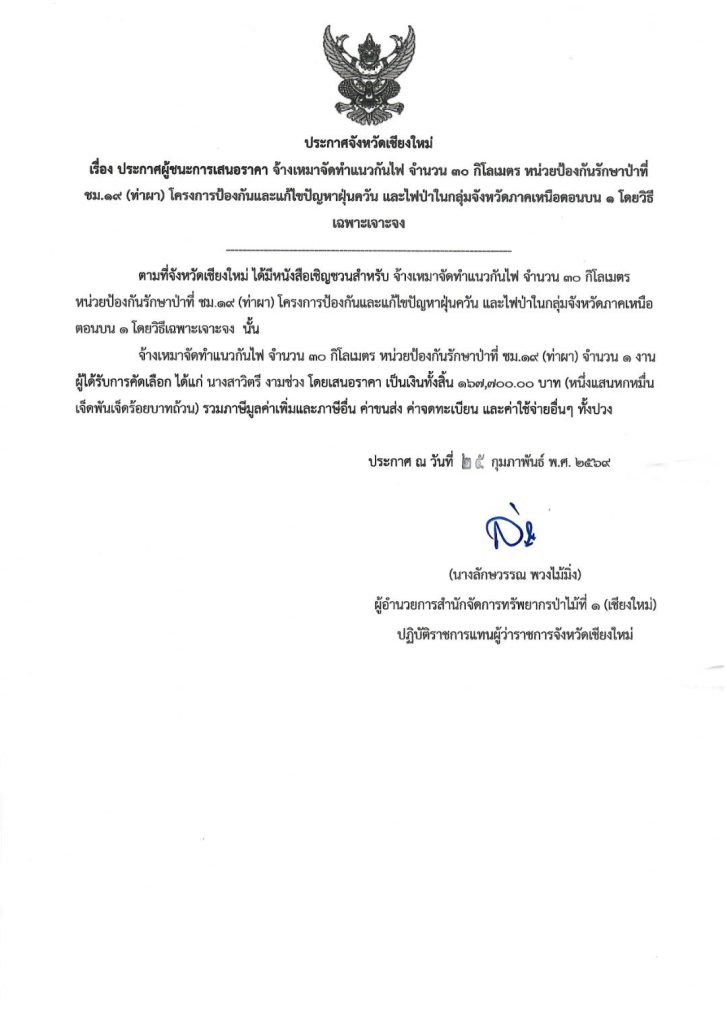 ประกาศผู้ชนะการเสนอราคา จ้างเหมาจัดทำแนวกันไฟ จำนวน ๓๐ กิโลเมตร หน่วยป้องกันรักษาป่าที่ ชม.๑๙ (ท่าผา) โครงการป้องกันและแก้ไขปัญหาฝุ่นควันและไฟป่าในกลุ่มจังหวัด ภาคหนือตอนบน ๑ โดยวิธีเฉพาะเจาะจง5 มีนาคม 2026 ใน ประกาศจัดซื้อจัดจ้าง / ประกาศผู้ชนะการเสนอราคา by adminir