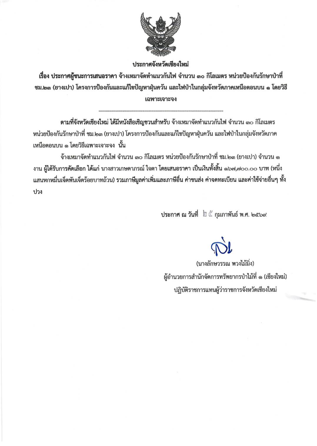 ประกาศผู้ชนะการเสนอราคา จ้างเหมาจัดทำแนวกันไฟ จำนวน ๓๐ กิโลเมตร หน่วยป้องกันรักษาป่าที่ ชม.๒๓ (ยางเปา) โครงการป้องกันและแก้ไขปัญหาฝุ่นควันและไฟป่าในกลุ่มจังหวัด ภาคหนือตอนบน ๑ โดยวิธีเฉพาะเจาะจง5 มีนาคม 2026 ใน ประกาศจัดซื้อจัดจ้าง / ประกาศผู้ชนะการเสนอราคา by adminir