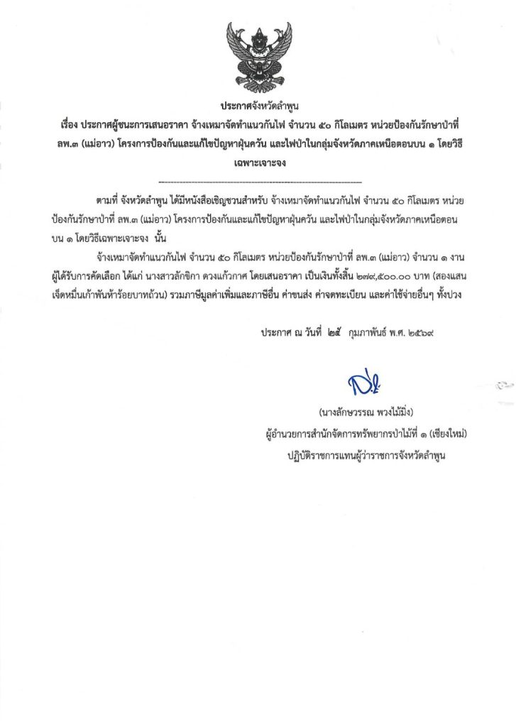 ประกาศผู้ชนะการเสนอราคา จ้างเหมาจัดทำแนวกันไฟ จำนวน ๕๐ กิโลเมตร หน่วยป้องกันรักษาป่าที่ ลพ.๓ (แม่อาว) โครงการป้องกันและแก้ไขปัญหาฝุ่นควัน และไฟป่าในกลุ่มจังหวัดภาคเหนือตอนบน ๑ โดยวิธีเฉพาะเจาะจง