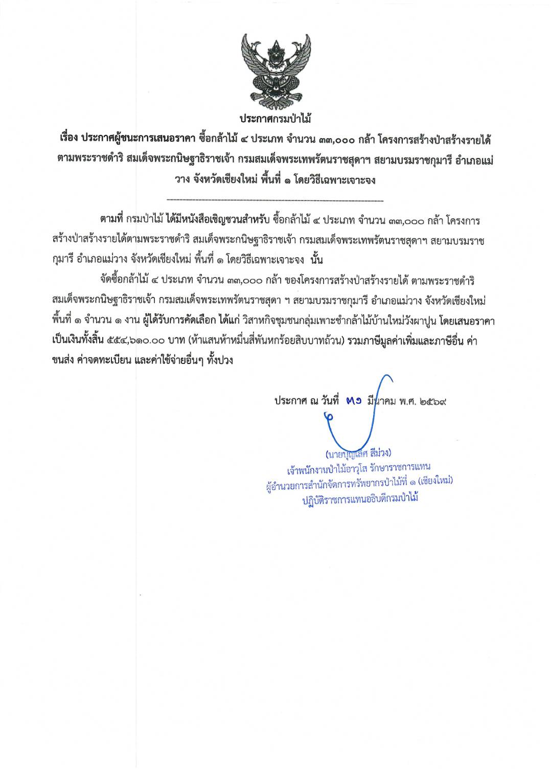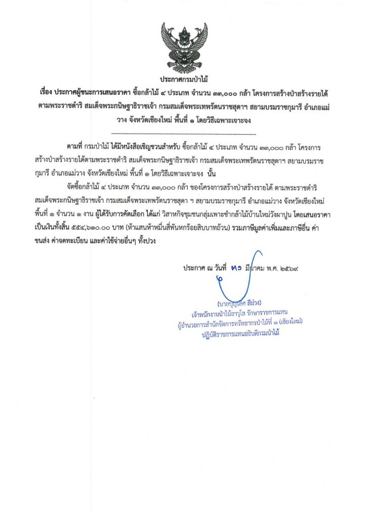 ประกาศผู้ชนะการเสนอราคา ซื้อกล้าไม้ ๔ ประเภท จำนวน ๓๓,๐๐๐๐ กล้า โครงการสร้างป่าสร้างรายได้ตามพระราชดำริ สมเด็จพระกนิษฐาธิราชเจ้า กรมสมเด็จพระเทพรัตนราชสุดาฯ สยามบรมราชกุมารี อำเภอแม่วาง จังหวัดเชียงใหม่ พื้นที่ ๑ โดยวิธีเฉพาะเจาะจง
