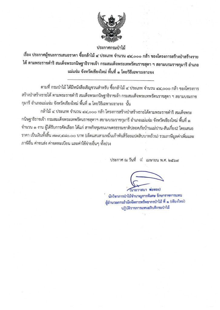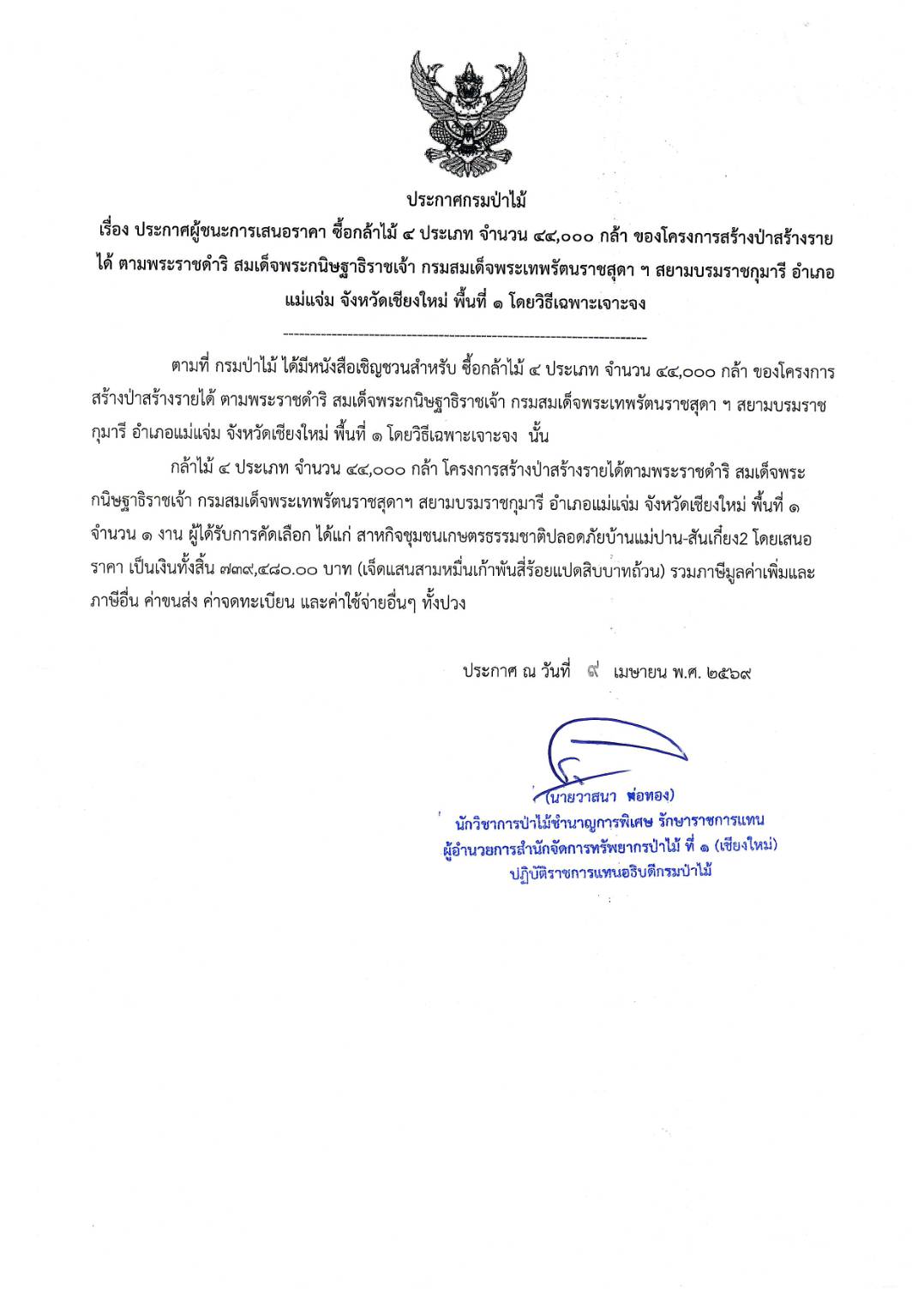ประกาศผู้ชนะการเสนอราคา ซื้อกล้าไม้ ๔ ประเภท จำนวน ๔๔,๐๐๐๐ กล้า ของโครงการสร้างป่าสร้างรายได้ ตามพระราชดำริ สมเด็จพระกนิษฐาธิราชเจ้า กรมสมเด็จพระเทพรัตนราชสุดา ฯ สยามบรมราชกุมารี อำเภอแม่แจ่ม จังหวัดเชียงใหม่ พื้นที่ ๑ โดยวิธีเฉพาะเจาะจง