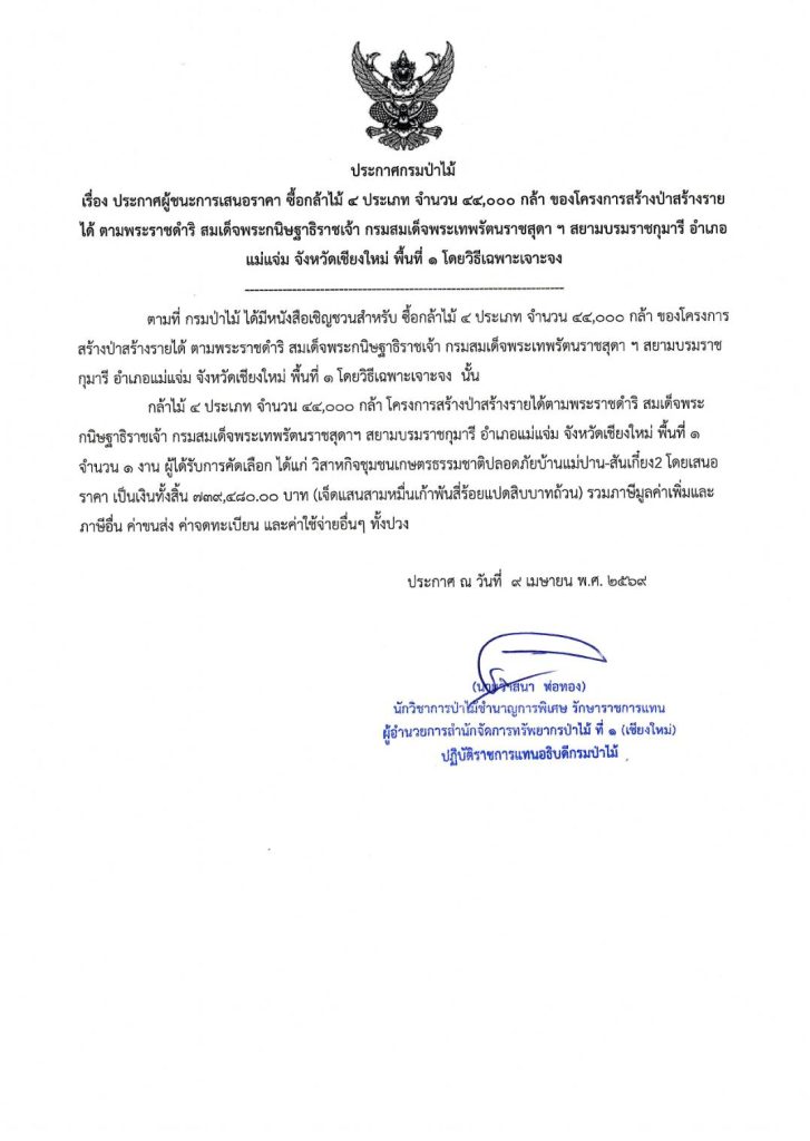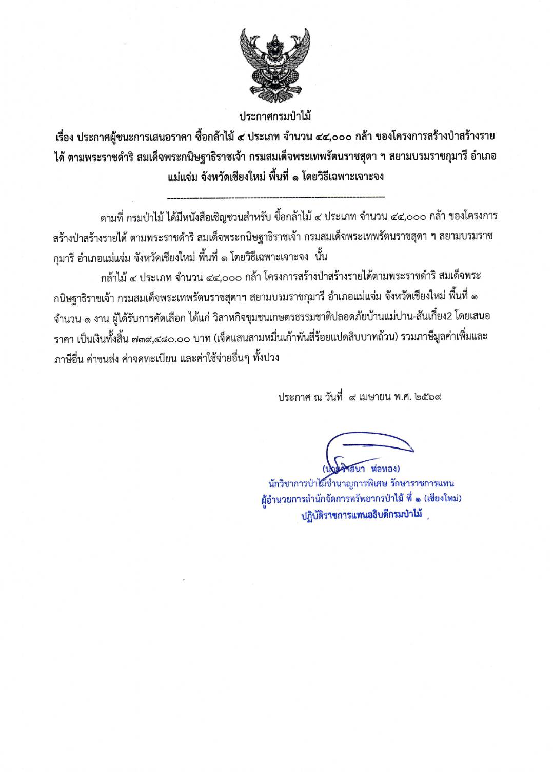 ประกาศผู้ชนะการเสนอราคา ซื้อกล้าไม้ ๔ ประเภท จำนวน ๔๔,๐๐๐ กล้า ของโครงการสร้างป่าสร้างรายได้ ตามพระราชดำริ สมเด็จพระกนิษฐาธิราชเจ้า กรมสมเด็จพระเทพรัตนราชสุดา ฯ สยามบรมราชกุมารี อำเภอแม่แจ่ม จังหวัดเชียงใหม่ พื้นที่ ๑ โดยวิธีเฉพาะเจาะจง