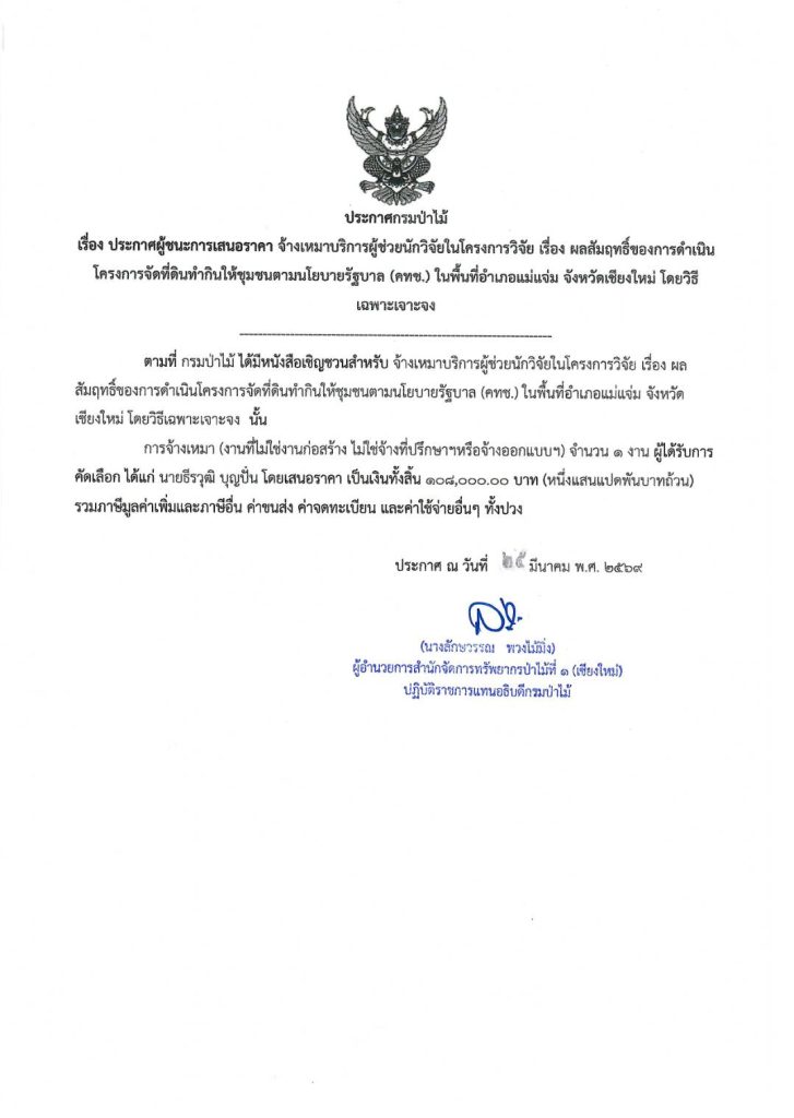 ประกาศผู้ชนะการเสนอราคา จ้างเหมาบริการผู้ช่วยนักวิจัยในโครงการวิจัย เรื่อง ผลสัมฤทธิ์ของการดำเนินโครงการจัดที่ดินทำกินให้ชุมชนตามนโยบายรัฐบาล (คทช.) ในพื้นที่อำเภอแม่แจ่ม จังหวัดเชียงใหม่ โดยวิธีเฉพาะเจาะจง