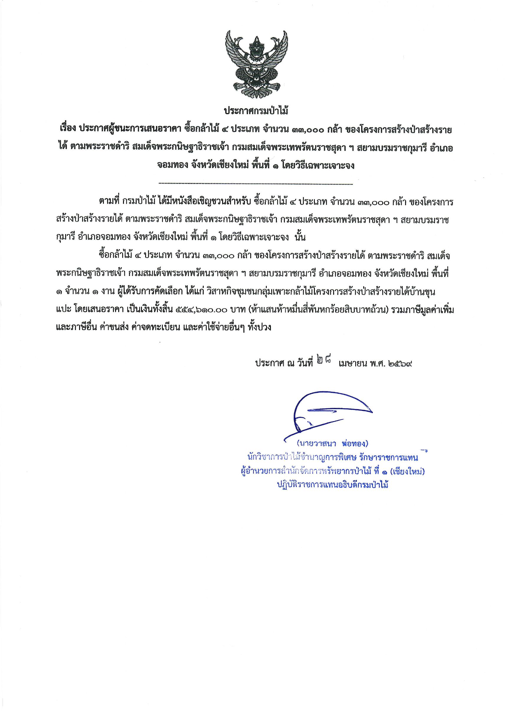 ประกาศผู้ชนะการเสนอราคา ซื้อกล้าไม้ ๔ ประเภท จำนวน ๓๓,๐๐๐ กล้า ของโครงการสร้างป่าสร้างรายได้ตามพระราชดำริ สมเด็จพระกนิษฐาธิราชเจ้า กรมสมเด็จพระเทพรัตนราชสุดา ฯ สยามบรมราชกุมารี อำเภอ จอมทอง จังหวัดเชียงใหม่ พื้นที่ ๑ โดยวิธีเฉพาะเจาะจง28 เมษายน 2026 ใน ประกาศจัดซื้อจัดจ้าง / ประกาศผู้ชนะการเสนอราคา by adminir